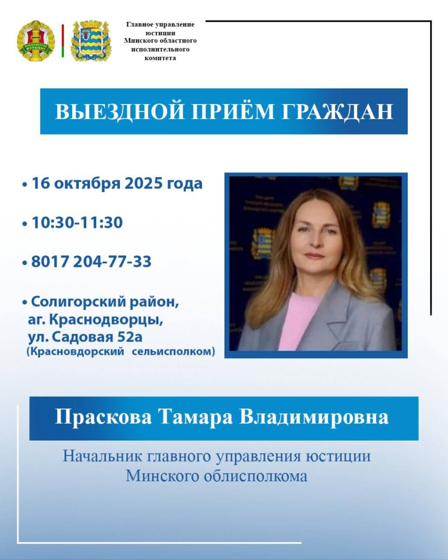 16 октября 2025 года с 10:30 до 11:30 начальник главного управления юстиции Тамара Праскова проведет выездной прием граждан в Краснодворском сельисполкоме (аг. Краснодворцы, ул. Садовая, 52а, Солигорский район).